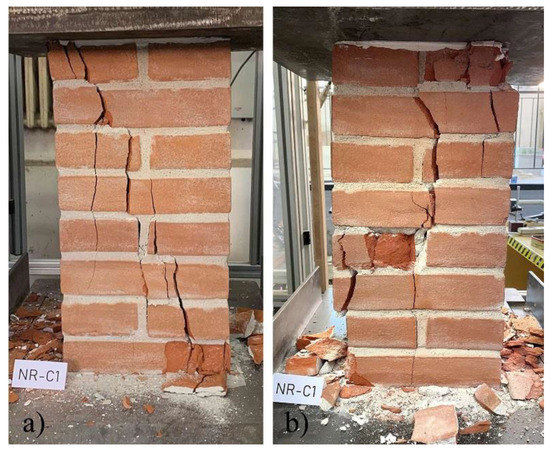 Reference failure mode of unreinforced masonry columns (NR-C1 specimen): (a) front and (b) back sides.