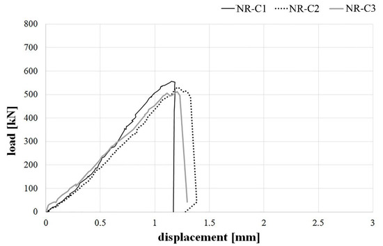 The three unstrengthened columns, labelled NR-C1, NR-C2, NR-C3 in Table 5, showed very similar behaviour during the tests and the same type of failure. The specimens highlighted vertical cracks triggered in the upper or lower sides and then quickly expanded up to the middle of the specimens (Figure 9). Load-displacement diagrams showed linear elastic behaviour up to the peak load without a softening phase, while a brittle failure occurred (Figure 10).