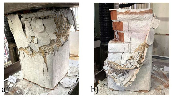 The masonry columns strengthened with the FRLM composite were tested according to the same procedure that was followed for the unstrengthened ones. A first crack occurred from the top towards the middle of the specimen, and, as the load increased, the surface of the lime matrix highlighted many cracks due to the beginning of the sliding between the fabric and the matrix. A first detachment occurred between the outermost layer of the matrix and the fabric, then the sliding continued up to the complete detachment from the masonry substrate due to the failure of the column inner core. At the end of the test, the fabric remained mostly undamaged even if completely detached by the matrix layers (Figure 11a) while the inner core of the specimen appeared largely damaged (Figure 11b).