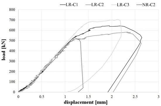 Load-displacement diagrams were compared to the curve of the NR-C2 unstrengthened column, taken as a reference (Figure 12). The comparison highlights that the behaviour of the unstengthened and the strengthened columns is rather similar in the ascending branch, confirming that wrap scarcely collaborates in this phase, becoming effective only after that the value of the maximum load of the unstrengthened column was reached. A large “post-elastic” branch can be appreciated corresponding to the phase of sliding between the fabric and the surrounding matrix. The FRLM wrap was demonstrated to be able to provide an increase in load-bearing capacity and ductility. As is well known, columns typically show a brittle behaviour, and an increase of ductility is largely desired in seismic areas.