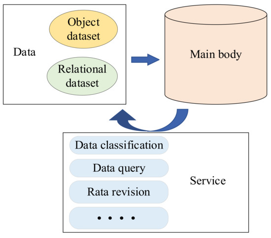 Subject, data set, and service are three elements of data space, as shown in Figure 1. The subject is the description object of data space. The power transmission and transformation project is regarded as a network system with multiple subjects, which includes both the subject of network node substation and the subject of network connection line transmission line. Data set refers to the set of controllable data, including the object data set and the relational data set between objects. In turn, the subject manages the data through service behaviors, such as data classification and data query.