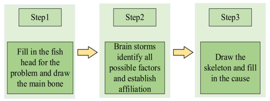 Fishbone diagram analysis is one of the methods often used in causal analysis. It is essentially a tool for discovering the underlying causes of things; thus, it can be called a “causal diagram”. However, it is also called “fishbone diagram” because of its resemblance to a fishbone. This is an analysis method of progressive decomposition of the causes of the results and the factors that form things from the outside to the inside and from the top to the bottom in the form of a brainstorm after determining the research object. The specific analysis process is shown in Figure 2. In the whole fishbone, the factors between adjacent levels are subordinate and related. According to different purposes, fishbone diagrams can be divided into three categories, namely, problem fishbone diagram, reason fishbone diagram, and countermeasure fishbone diagram.