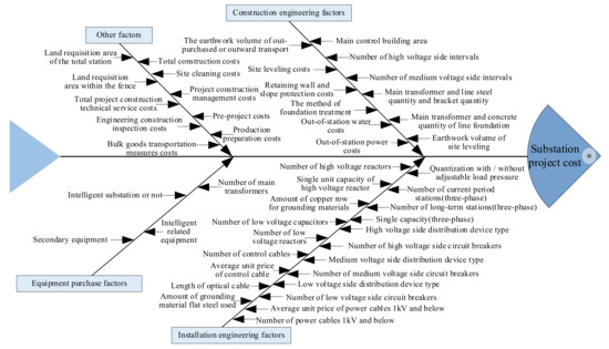 Through investigation and research, establishing the substation engineering cost impact factors can be roughly divided into policy factors, management factors, and technical factors. Construction engineering factors, installation engineering factors, equipment purchase factors, and other factors are all technical factors. In this paper, the fishbone diagram analysis method is used to conduct data mining based on substation engineering information, and feature extraction and screening of the construction-related data of the whole life cycle in its data space are carried out as the basis for the prediction of substation engineering cost. Considering that policy factors and management factors have little variability and are difficult to quantify, the fishbone diagram method here only analyzes the technical factors based on cost compositions that have the greatest impact on substation engineering investment, as shown in Figure 3 below.