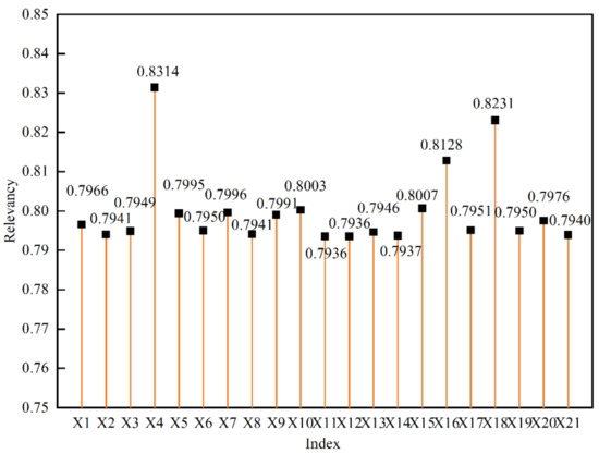 Equations (4)–(9) is used to further screen the relevant factors of the primary library to obtain the model input index. To maintain a high correlation between input and output metrics, therefore, combined with the correlation degree of the influencing factors and expert experience, 0.8 is used as the threshold to screen the installation engineering cost. As shown in Figure 6 below, X4, X10, X15, X16, and X18 are finally selected as the input indexes of installation engineering cost.