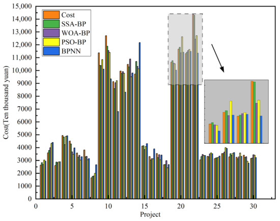 - In this paper, the SSA is used to optimize the weights and thresholds of a BP neural network, thus predicting the cost of substation engineering. The prediction results show that compared with the unoptimized BP neural network model and the WOA-BP and PSO-BP prediction models, the SSA-BP intelligent prediction model proposed in this paper has better prediction accuracy and can be used for actual prediction.