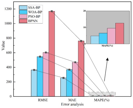 According to Table 6, the results of three error indexes of the SSA-BP model are far lower than the BPNN model, the PSO-BP model, and the WOA-BP model. The error index MAPE of the SSA-BP prediction model is less than 5%. According to historical experience, it can meet the actual requirements of power grid project cost, that is, to meet the needs of practical work. In order to enhance the visualization and compare the prediction accuracy of the four models more intuitively, the error evaluation results are drawn in Figure 8 below.