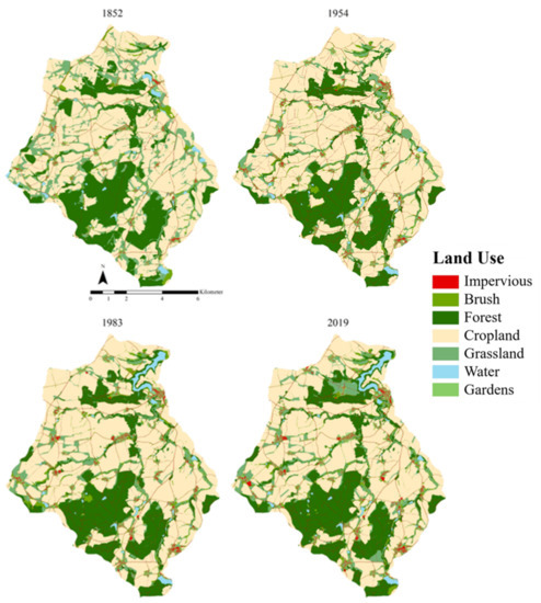 Three land-use scenarios were run in addition to the calibrated model (Table 1). The scenarios are defined by land-use changes across time: 1852 (pre-Communist Era), 1954 (early Communist Era), 1983 (late-Communist Era), and 2019 (default/calibrated model and post-Communist Era; Figure 2). In the pre-Communist Era scenario, there were typically buffer zones of forest or brush between agricultural fields. In the Communist and post-Communist eras, the fields were much larger and more monotonous, which increased the probability of surface runoff events and erosion; during these time periods, subsurface tile drainage systems were incorporated across all agricultural land-uses in the Vrchlice SWAT model.