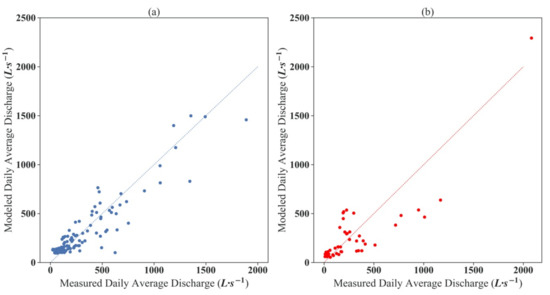 A scatterplot correlation is presented in Figure 4, with a trendline for reference. Paired t-tests comparing the measured versus modeled was conducted individually for the calibration and validation periods, and no significant differences were observed (p > 0.05).