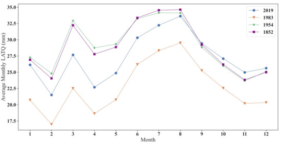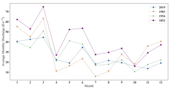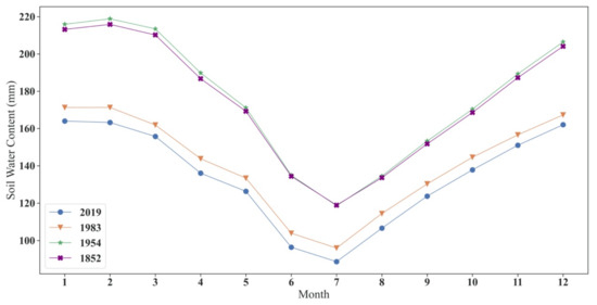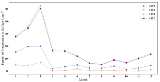 The following monthly basin-wide water balance parameters were analyzed across the four land-use change scenarios: evapotranspiration, the daily average discharge at the outlet, average soil water content, subsurface lateral flow contribution to streamflow, and percent of the precipitation that results in surface runoff. Evapotranspiration is not represented in a graphical form because the differences between the scenarios were very slight due to the fact that the total land-use changes in percent cover varied little across the four land-use change scenarios. Generally, the discharge at Vrchlice’s outlet was highest in the 1852 scenario; the greatest extremes in streamflow were also observed in the 1852 scenario, while the most stable flows were recorded in the 2019 scenario (Figure 5). The 1852 and 1954 scenarios resulted in very similar water balance outputs except in discharge at the outlet, which is likely due to reservoir management. The soil water content across the basin was separated into two obvious groups, with much higher soil water contents in the 1852 and 1954 scenarios (pre-Communist and early Communist eras, respectively). The lower soil water contents in the 1983 and 2019 scenarios (late-Communist and post-Communist eras, respectively) are likely due to the incorporation of widespread tile drainage systems across the landscape in the 1970s (Figure 6), which also can explain the patterns observed in the percent rainfall resulting in surface runoff across the scenarios (Figure 7). Throughout most of the year, the highest subsurface lateral flow contribution to streamflow was modeled in the 1852 and 1954 land-use scenarios, while the 2019 land-use scenario exhibited the highest values from September through December (Figure 8). The lowest subsurface lateral flow contribution to streamflow values occurred in the 1983 land-use scenario across all months, and it also exhibited the greatest range in values across the year.