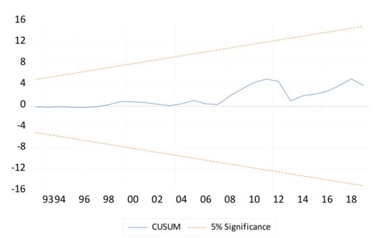 - Pesaran, M.H.; Shin, Y.; Smith, R.J. Bounds testing approaches to the analysis of level relationships. J. Appl. Econom. 2001, 16, 289–326. [Google Scholar] [CrossRef]