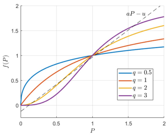 Plot of the function for , , and different values of q. The intersections of the dashed line with the plot of correspond to the equilibria.