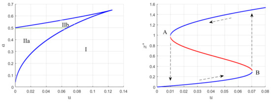The left diagram of Figure 2 provides a decomposition of the parameter space w.r.t. the number of roots: it shows the regions of the parameter space where the right-hand side of (2) has either one (region I) or three (region II(a,b)) roots. In the latter case, the system (2) has two stable and one unstable equilibria, with the unstable equilibrium being located between the two stable ones, separating the domains of attraction of the stable equilibria. The right diagram shows the emergence and disappearance of steady states for varying values of u for a fixed value of a, here , viz. it displays a bifurcation diagram for region IIb.
