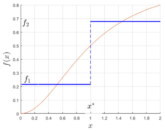 Piece-wise approximation (blue) of the function (red) over the interval . The values of are and . The switching occurs at , where the approximating function is discontinuous (dashed line).