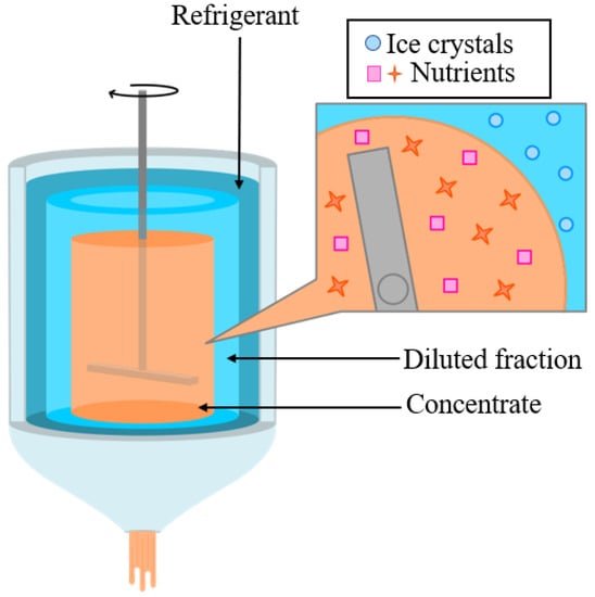 The FC performance was investigated under two methodological approaches, a progressive freeze concentration (PFC) and a suspension freeze concentration (SFC), set through the utilization of different lab-scale FC configurations described in detail in the following sections. A multi-stage PFC and SFC was performed as illustrated in Figure 1.