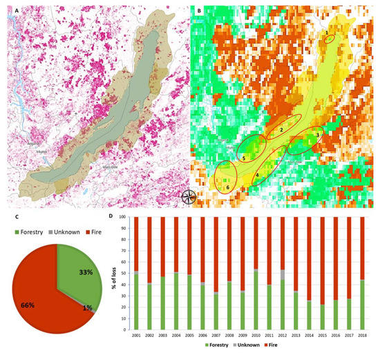 The Lake Baikal World Heritage site analysed intersecting Landsat data (2013–2018; [9]) with the layer of forest loss by dominant driver [10]: (A) in light yellow the border of the protected area, in magenta the areas with tree loss from 2001 to 2018 (>30% forest cover); (B) the forest loss by dominant driver: in red the loss attributable to wildfires, in green the loss attributable to forestry activities, with numbers and red circles as selected areas of loss attributable to forestry used in the additional validation through satellite and aerial images (see Figure 2); (C) the percentage of 2001–2018 forest loss attributable to each dominant driver; (D) the annual variation in the percentage of loss attributable to each dominant driver.