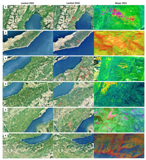 The land-use change in six selected areas of loss attributable to forestry activities (the red circles in Figure 1B) within the Lake Baikal World Heritage borders analysed through satellite (comparison of Lidar in 2001 and 2018) and aerial photos with a zoom on the red areas (in the Lidar 2018 image) where forest loss is shown with higher resolution by the 2021 Maxar technology image (in false colours that evidence hot zones—yellow/orange/red/purple—are the logged areas).