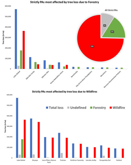 We found that although fire is responsible for 75% of the loss in all strict PAs, forestry activities still account for 16%, and 9% is due to undefined causes (Figure 3). Among the strictly PAs, most affected by tree loss due to forestry, fire represented the main driver only for the Lake Baikal World Heritage and the Kama-Bakaldino mires. Lake Baikal PA ranks first also among Strict PAs most affected by fire (Figure 3).
