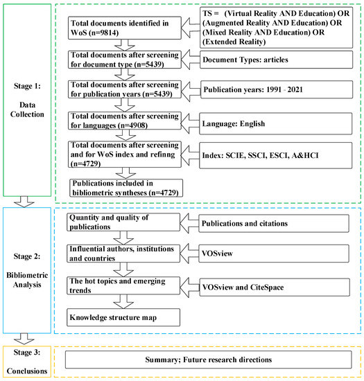 This paper explores research articles on XR application in education collected via the Web of Science (WoS) database for the period 1991–2021, inclusive. Data were retrieved on August 16, 2021. Keywords were searched in the topic column. The search function was as follows. TS = (virtual reality AND education) OR (augmented reality AND education) OR (mixed reality AND education) OR (extended reality AND education). Document type was limited to research papers written in English. The articles indexed in SCIE (2786)/SSCI (1772)/ESCI (1116)/A-HCI (89) were chosen. A journal may be double-indexed. A total of 4729 works were obtained. The research roadmap is shown in Figure 1.