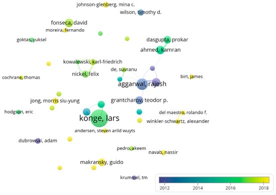The second author with the largest number of articles is Aggarwal, Rajesh (Southend University Hospital), followed by Darzi, Ara (University of Wyoming), Ringsted, Charlotte (Aarhus University), and Ahmed, Kamran (King’s College London) with more than 15 papers. Grantcharov, Teodor P. (Saint Michaels Hospital Toronto) is the author who has been cited most (978) and has the highest average citation (70). Several authors have published a large number of papers and the number of citations is unevenly distributed. Makransky, Guido as the first author has the largest number of articles (n = 8). They have published many papers on the topic on learning within immersive VR environments [50,51]. Among the top 10 leading authors, 40% (4/10) come from Denmark and 30% (3/10) authors come from the UK.