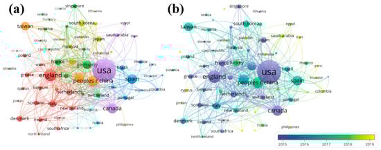 Country and region collaboration networks. (a) Collaboration network visualization map; (b) Collaboration overlay visualization map.
