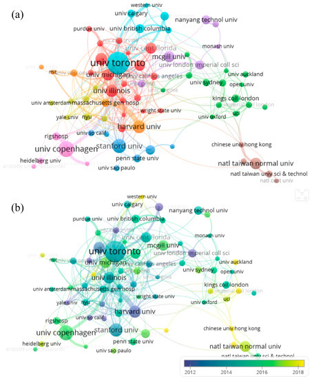 Figure 5 illustrates the networks of institutional collaboration. Node size is directly proportional to publication numbers. The larger the node, the greater number of institution documents published. The connecting link indicates the degree of institutional academic cooperation. When the “minimum number of documents of an organization” was set to 15, there were 79 of the 4257 organizations qualified. They were divided into nine clusters each represented by a different color (Figure 5a).