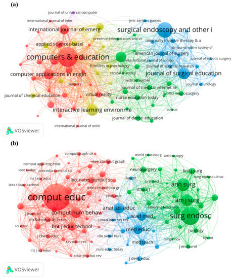 Co-citation analysis of the cited sources was also conducted by VOSviewer. When the minimum number of citations of a source was set to 184, 100 of the 50,800 sources appeared, as shown in Figure 6b. The most cited journals are Computers and Education (4635 co-citations), Surgical Endoscopy (2774 co-citations), Annals of Surgery (1711 co-citations), American Journal of Surgery (1537 co-citations), and Computers in Human Behavior (1349 co-citations). The top five journals belong to two disciplines, computer science and medicine.