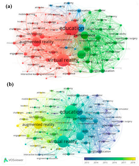In cluster 1, many prominent keywords were associated with the term “education”. There were many prominent keywords, such as virtual reality, augmented reality, technology, students, system, reality, design, impact, and environment (Figure 7a; Table S4 in Supplementary Materials). In cluster 2, linked to the term “simulation” were keywords such as performance, skills, surgery, surgical education, validation, training, operating-room, medical-education, virtual-reality simulation, laparoscopy, and curriculum. This cluster highlights the characteristics and practical application of XR. It generates a simulation environment, so that users can immerse themselves in the environment.