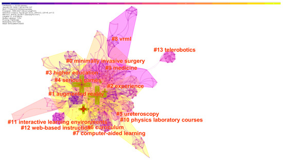 As for technical support, research focuses on these topics, such as augmented reality (cluster 1), computer-aided learning (cluster 7), virtual reality modeling language (VRML) (cluster 8), web-based instruction (cluster 12), and telerobotics (cluster 13). The application of XR in education has been involved in many aspects, such as minimally invasive surgery (cluster 0), experience (cluster 2), ureteroscopy (cluster 4), and medicine (cluster 9).