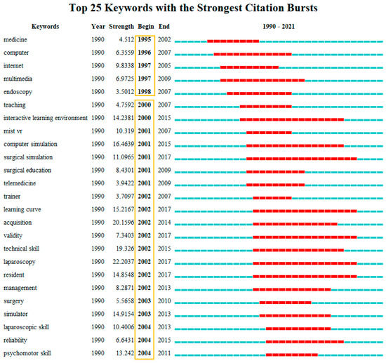 Keyword citation burst is an important identifier of emerging research trends [70]. In order to better understand which research hotspots frequently appear and how long they lasted in each time period, this study used CiteSpace to conduct the keyword citation burst analysis (Figure 9). Before 2000, the most attended to topics in the XR field were medicine, computer, internet, multimedia, and endoscopy. This puts forward the possibility and prospect of XR application in education.
