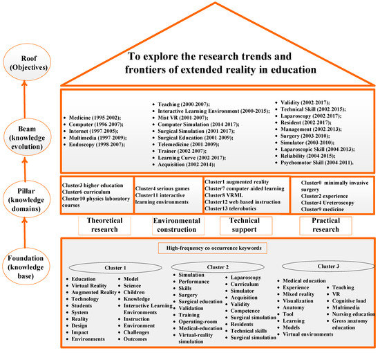 In order to show clearly the knowledge evolution of applying XR in education, an integrated knowledge structure map was built (Figure 10). Following the method used in a prior study [73], the knowledge structure map was composed of the knowledge base, knowledge domain, and knowledge evolution.