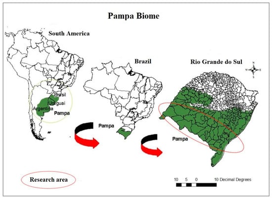 Location of the Pampa biome in South America and Brazil and the research area (Source: Adapted from []).
