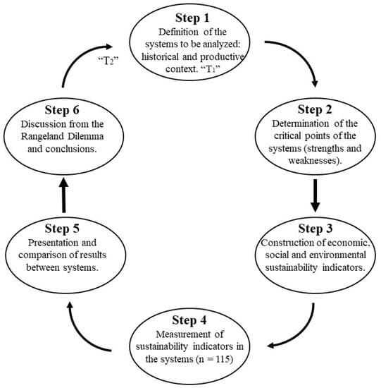 The study is structured as follows: after the introduction, the study context is presented, highlighting the transformations of the rangeland exploitation in the Brazilian Pampa biome, followed by the MESMIS operational cycle, which methodologically substantiates the research. “The MESMIS method was defined by Masera et al. [] as the procedure for evaluating the economic, social, and environmental sustainability of livestock systems in the biome. The choice is justified by the method’s capability to create and measure sustainability indicators using the participation of the local actors themselves, from an interdisciplinary perspective. Subsequently, the results are presented, based on the critical points and sustainability indicators measured in 115 cattle farms in the Brazilian Pampa. Finally, the results are discussed in order to substantiate and prove the existence of the rangeland dilemma. This approach also addresses the importance of this study in proposing public policies that allow for the sustainable exploitation of natural resources of this biome. Thus, the article contributes to scientific research by presenting an analysis method that can be tested in other contexts where the rangeland dilemma may need to be verified.