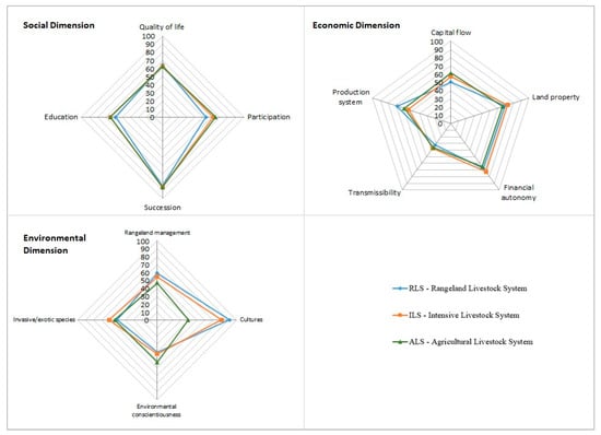 In Figure 3, the indicators for each sustainability dimension between livestock systems are presented comparatively. Clear similarities can be seen in the social dimension trends, with emphasis on high “Succession” indicator values. This demonstrates the existence of successors, and in most establishments, their predisposition to remain in the livestock industry in the future, regardless of the system under analysis.