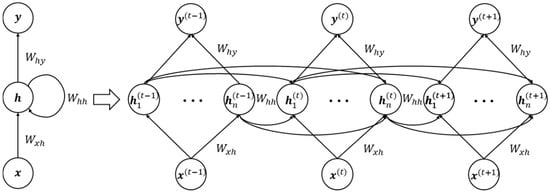 Regarding sequence data, the decision made at time step can influence the decision made at time step . Consequently, this intrinsic attribute of RNNs is suitable for the EV charging power demand forecasting problem since it has been pointed out that EV users’ charging patterns may be critical stochastic variables for the prediction of EV charging power demand at the next time intervals. The propagation formulation in RNNs at each time step is given in Equations (1)–(3).