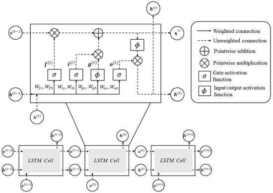 To solve this challenge, a long short-term memory is proposed by introducing the memory cell with standard RNNs. The augmented memory cell includes self-connection from a node, ensuring that the gradient can propagate across many time steps without vanishing or exploding. Furthermore, Gers et al. [31] proposed the forget gates with LSTM memory cell, and this architecture became a standard in most modern implementations for sequence learning. In this regard, the structure of LSTM cells is presented with its unrolled architecture, as shown in Figure 2. Furthermore, the calculation procedure at each time step of LSTM block is presented as the following formulations given in Equations (4)–(9).