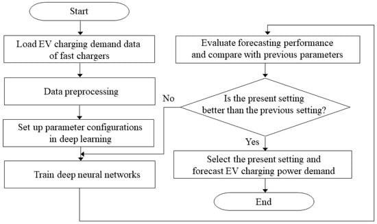 This section describes the proposed methodology for short-term EV charging power demand forecasting on the aggregation level. Figure 3 shows the details of the flowchart of the forecasting framework. This framework is briefly composed of four stages, as follows: (1) data preprocessing, (2) setting up parameters in a network, (3) network training, and (4) forecasting EV fast-charging power demand.