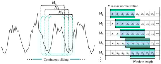 Due to the distinctive LSTM topology, it is evident that time-series data should be transformed to three-dimensional data like [batch size, time step, input dimension] . , , and denote the size of batch, the number of time steps, and the length of the input sequence, respectively. The window length, , is defined by , in which normalization conducts each time. Consequently, the window normalization is able to perform going down in each row of input shape . Figure 4 shows how to apply the window sliding min–max normalization in EV charging power demand.