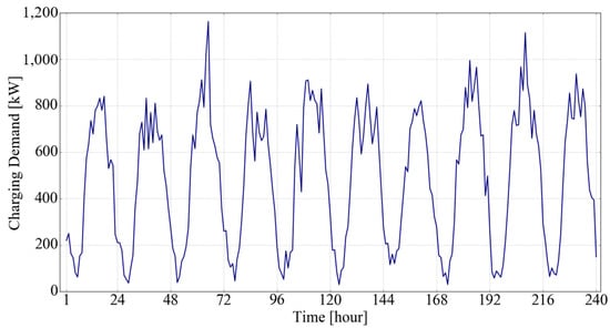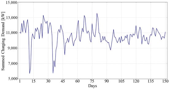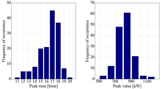 To describe the highly irregular pattern in more detail, fast-charging power demand is added as a daily interval in Figure 7. As shown in Figure 7, it is difficult to figure out the upward, downward, or consistent trends. Furthermore, in Figure 8, the distribution of peak time and peak value seems to be spread in a wide range of time. These results indicate that it is not easy to clarify the range of peak time and peak value.