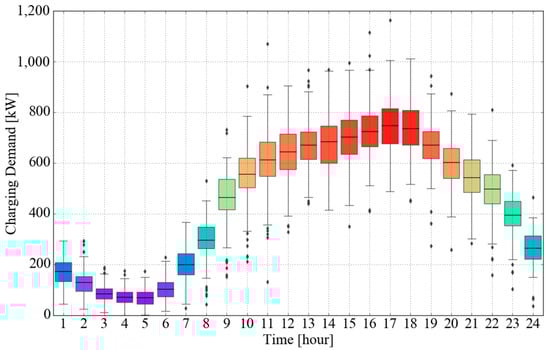 For the analysis of aggregated EV charging power demand from fast chargers, the charging pattern is shown in Figure 5. Although EV charging pattern was aggregated, it is difficult to figure out periodic and regular characteristics. To identify the general tendency of hourly profiles, the box plot is used to express the hourly average of charging power demand in Figure 6. As shown in Figure 6, the EV charging power demand increases in the daytime and reduces in the evening. This indicates that significant energy demand occurs during 15:00–18:00 in the power system. Interestingly, the temporal tendency of fast-charging power demand differs from that of slow charging process in which power demand increases in the evening (when the EV drivers go back home after work).