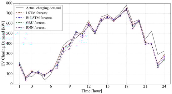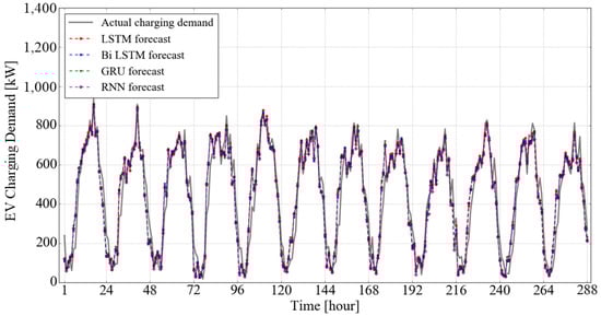 The comparison of forecasting results obtained by four different deep learning models with optimal hyper-parameters are illustrated in Figure 9 and Figure 10. The period shown in Figure 9 is 12 days (from 1 May 2018 to 12 May 2018), and the period shown in Figure 10 is 1 randomly selected day. Figure 9 and Figure 10 demonstrates that a deep learning model based on RNN neural network can accurately forecast the EV fast-charging power demand. LSTM model showed the best performance among deep learning models. As shown in Figure 10, the peak value occurs at 18:00, and it is accurately captured by the proposed LSTM model. Furthermore, LSTM can substantially follow the hill points of EV charging power demand much better while 11:00–12:00, 14:00–15:00, and 16:00–18:00. The forecasting results of the Bi-LSTM and GRU model slightly overlap in a given time period. The RNN model, however, seems to have a gap between forecasted and actual values.