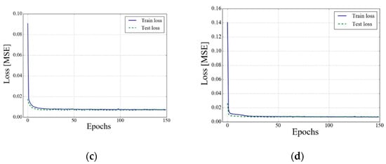 Train loss and test loss curves of each deep learning method: (a) LSTM method; (b) Bi-LSTM method; (c) GRU method; (d) RNN method.