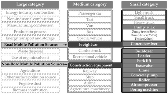 | This study | Bulldozer, loader, excavator, crane, concrete pump, roller, compressor, boring machine, forklift, concrete mixer truck, dump truck, trailer |