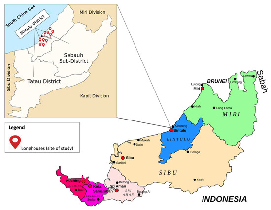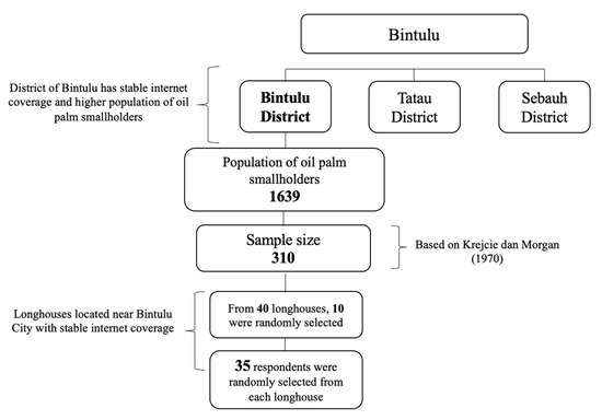 Figure 1), which has wide internet coverage and a large number of oil palm smallholders. Based on the Malaysian Palm Oil Board (MPOB) statistics, there are 1639 independent oil palm smallholders in the Bintulu district. Oil palm smallholders who participated in this study were randomly sampled from longhouses located near the town of Bintulu. Based on the Bintulu Division Administration Department and information on internet coverage in Bintulu, there are 40 registered longhouses near the town of Bintulu that have stable internet coverage [