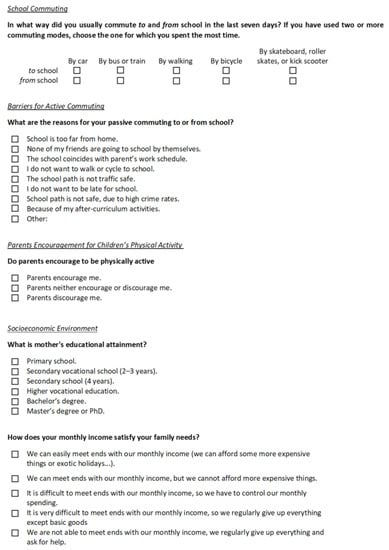 - Timperio, A.; Ball, K.; Salmon, J.; Roberts, R.; Giles-Corti, B.; Simmons, D.; Baur, L.A.; Crawford, D. Personal, Family, Social, and Environmental Correlates of Active Commuting to School. Am. J. Prev. Med. 2006, 30, 45–51. [Google Scholar] [CrossRef]