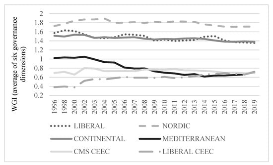 When analysing the changes in WGI (average for all six dimensions) over time (Figure 1), data show a strong persistence in governance scores and regional rankings. We can see that there are two groups of countries from this aspect—there is a significant and consistent gap between the Nordic, Continental, and Liberal countries, on the one hand (first group), and the Mediterranean and CEE countries (second group), on the other hand. Moreover, in the observed period, the Mediterranean countries have even reduced their scores, while CEEC LME countries have improved their scores the most. In terms of policy, the results of descriptive analysis indicate that CEE countries still strive for stronger control of corruption, more operative government, better rule of law, and higher regulatory quality. Based on the trends explored, it is likely to expect the Nordic countries to remain the top performers and Liberal and Continental countries to come closer to them in the medium- or long-run. Yet, it is highly unlikely that Mediterranean and CEEC will join the three leading groups of countries anytime soon. This result is in line with the findings of the University of Gothenburg [], which highlight that a group of old EU members, such as Germany, Sweden, the Netherlands, Denmark, or Finland, exhibits steadily high levels of quality of government irrespective of the particular index used to capture good governance. In addition to their finding, we have shown that some of the members in that group of countries have surprisingly low levels of governance quality (i.e., Mediterranean countries). Additionally, Glawe and Wagner [], analysing the formation of institutional convergence clusters within the EU over the period from 2002 to 2018 by using Phillips and Sul’s log t test, pointed to the existence of multiple institutional clubs for the WGI dimensions “government effectiveness”, “regulatory quality”, “rule of law”, and “control of corruption”, as well as for the mean of these four indicators. Precisely, the authors outline a northwest-southeast divide for all indicators, where among the NMS, the Baltic States perform best, whereas the rest of NMS and Mediterranean countries are rather stuck in poor institutional traps.