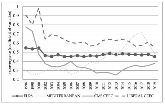 In order to grasp the causes of previously described trends, in further steps, we calculated the coefficient of variation as a measure of dispersion for selected groups of countries in order to test for the σ-convergence (in the period from 1996 to 2019) (Figure 2). The application of σ-convergence is somewhat problematic because the ‘Liberal’ cluster combines two countries only. More generally, based on the low number of observations within some clusters, the variance within clusters is sensitive to changes in one country, and differences between clusters are, hence, difficult to interpret with respect to their significance. Therefore, in the next step, we compare CEECs with the EU28 average on one side and Mediterranean countries on the other side.