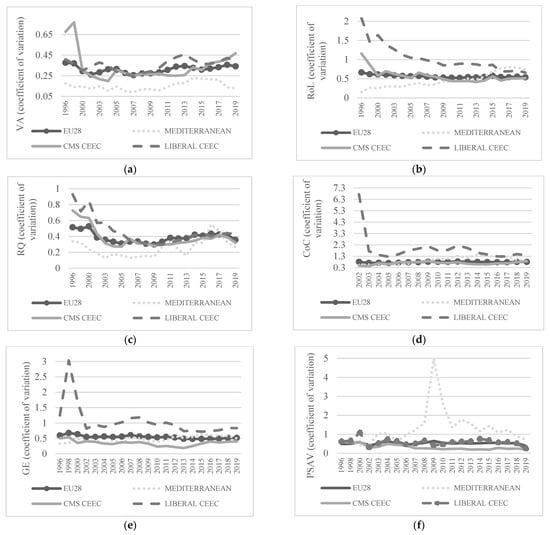 For the purpose of this article, i.e., to investigate the convergence of Eastern European countries as a potential result of the transfer of Western formal institutions to those countries, the latest edition of the Worldwide Governance Indicators (WGI) dataset was used. The issue of institutional cconvergence is of high economic interest since it is positively related to real (economic) convergence, and a better understanding of institutional development is much needed in order to achieve economic convergence through institutional development []. Within this, while real convergence usually refers to the convergence in GNI per capita, under the term institutional convergence, we describe the convergence in institutions, i.e., in rules of the game in a society as defined by North []. In order to grasp the causes of revealed trends, in further steps, we calculated the coefficient of variation as a measure of dispersion for each group of countries in order to test for the sigma (σ) convergence and tested the unconditional beta (β) convergence, performing a cross-section regression analysis in the period from 1996 to 2019. It is assumed that σ-convergence is present when the coefficient of variation declines between the periods, while β-convergence occurs when the parameter β is negative and statistically significant. In performing our analysis, we rely on the literature dealing with real and institutional convergence parameters [,,,,].