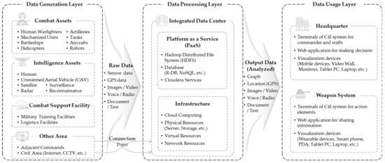 On the battlefield, a C4I system is a tool that exchanges information between numerous networked battlefield elements under the concept of “Sensor to Shooter” and supports the commander’s determination and shooter’s action effectively. In particular, it is divided into three layers according to the processes of generating, processing, and using battlefield data used in the C4I system, which are expressed in the data generation, data processing, and data usage layers. The details of each layer are presented below and are depicted in Figure 1.