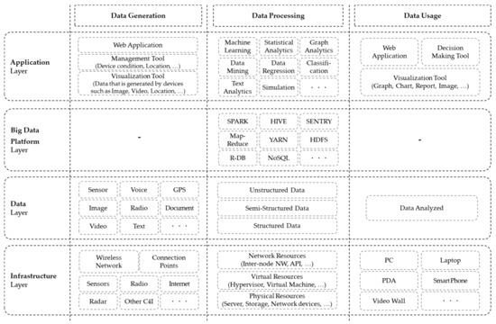 - Data Processing Layer: This layer runs in the integrated data center, where major big data lifecycle phases are implemented to store and analyze the collected data. The data processing layer can be divided into infrastructure and platform (or Platform as a Service (PaaS)). Infrastructure means physical/virtual resources such as cloud computing, network devices, etc., and the big data system platform may be, e.g., Hadoop, Cloudera, etc.