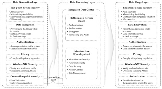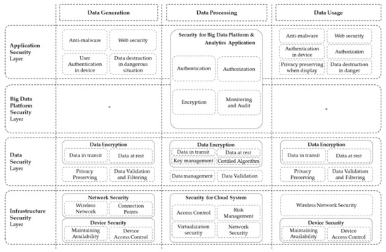 In an application security layer, security for user-centered software and hardware is defined for each layer. For example, the authentication of software directly accessed by users is strengthened, and the security of the web environment is required for data generation and usage layers. In the data processing layer, which is equivalent to big data analytics, security factors of the big data platform layer are also considered to require the same level of security because it provides Hadoop-based services.